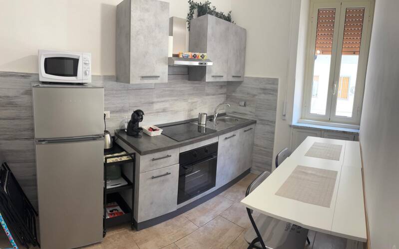 La cucina è completamente attrezzata con piano cottura a induzione, frigorifero, forno a microonde, macchina per caffè, bollitore elettrico e stoviglie.